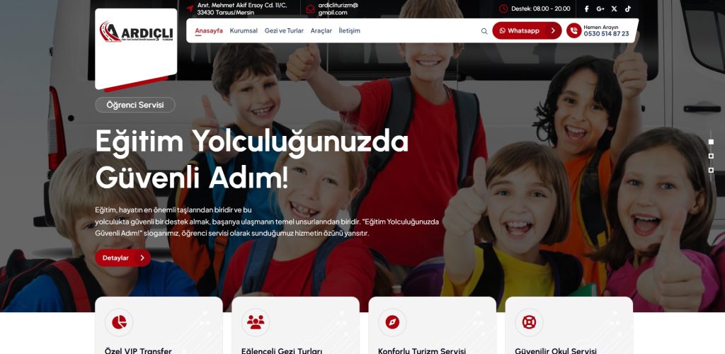 Ardıcı Turizm için tasarladığımız kurumsal web sitesi, firmanın öğrenci taşıma ve personel servisindeki güven, konfor ve profesyonellik anlayışını en net şekilde yansıtan dijital yüzü oldu. Modern, kullanıcı dostu arayüzü, mobil uyumluluğu ve hızlı erişim özellikleriyle hem velilere hem de kurumsal müşterilere güven veren bir platform oluşturduk. Anasayfada kullanılan etkileyici görseller ve net iletişim butonları (özellikle sabit WhatsApp iletişim ikonu) sayesinde dönüşüm oranları ciddi oranda artırıldı. SEO altyapısı, kurumsal kimliğe uygun renk ve tipografi seçimleri, hizmetlerin kategorize edilerek kolay ulaşılabilir hale getirilmesi ve güvenilirlik algısını pekiştiren detaylı içerik düzenlemeleriyle Ardıcı Turizm artık dijitalde de sektördeki lider konumunu güçlü bir şekilde temsil ediyor.